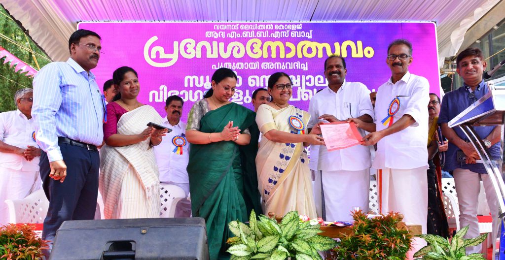 വയനാട് മെഡിക്കൽ കോളേജിലെ ആദ്യ എം.ബി.ബി.എസ് ബാച്ച് വിദ്യാർത്ഥികളുടെ പ്രവേശനോത്സവം ഒരു നാടിൻ്റെ ആഘോഷമാക്കി ആരോഗ്യ-വനിതാ ശിശു വികസന വകുപ്പ് മന്ത്രി വീണാ ജോർജ്  ഉദ്ഘാടനം ചെയ്തു. മാനന്തവാടി- അമ്പുകുത്തിയിൽ 28 ഏക്കറിൽ എല്ലാ സൗകര്യങ്ങളോടെയുമുള്ള മെഡിക്കൽ കോളേജ്  ക്യാമ്പസ് ഒരുക്കുമെന്ന് മന്ത്രി പറഞ്ഞു. മെഡിക്കൽ വിദ്യാഭ്യാസത്തിനായി സംസ്ഥാനത്ത്  തന്നെ  സൗകര്യങ്ങളൊരുക്കുകയെന്നത് സർക്കാരിൻ്റെ പ്രഖ്യാപിത ലക്ഷ്യമാണ്. എല്ലാ ജില്ലകളിലും സർക്കാർ മെഡിക്കൽ കോളേജുകളുള്ള സംസ്ഥാനമായി കേരളം. എല്ലാ ജില്ലകളിലും ഗവ. നഴ്സിങ് കോളേജുകളെന്ന ലക്ഷ്യവും കൈവരിച്ചു. വയനാട് മെഡിക്കൽ കോളജിൽ 15 സൂപ്പർ സ്പെഷ്യാലിറ്റി തസ്തികകൾ അനുവദിച്ചതായും മന്ത്രി പറഞ്ഞു.